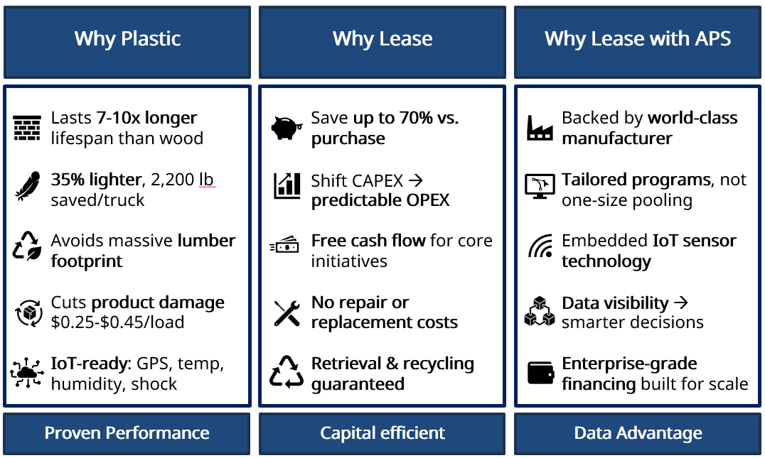 APS pallets can be equipped with RFID and IoT sensors that monitor location, dwell time, and conditions like temperature, humidity, and impact. This turns pallets from consumables into trackable assets and data sources—helping reduce losses, geofence high-risk nodes, and surface inefficiencies hidden in your network. In an environment where visibility gaps drive higher costs and risk, APS delivers analytics that give leaders the intelligence they need to protect margin and improve performance.